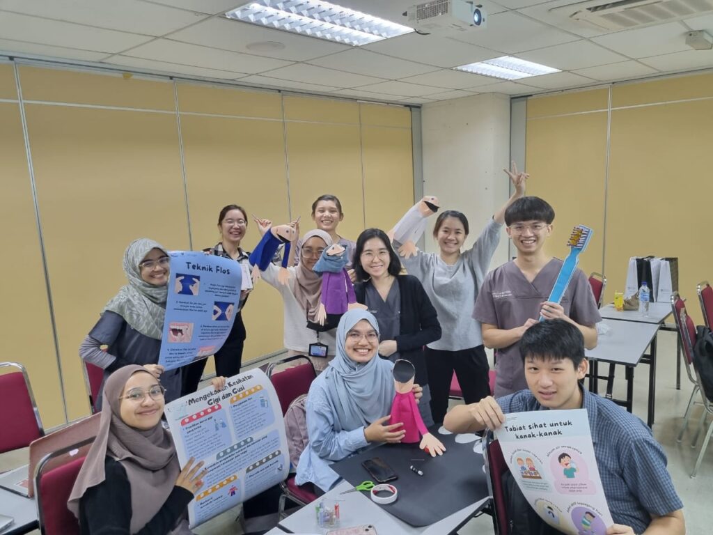 Reflecting on their experiences, students Loo Jing Thong and Aishah Chung Shau Keong expressed that the SULAM project had motivated them to give back to the community. Nur Afrina Husna, Stephanie Hooi Kah Wai, and Ng Yu Juin gained valuable field experience assisting lecturers in dental treatments. They also created game-based learning tools for children’s oral health education, including Wong Wei Shen’s web-based dental fun run and Afiqah Razali’s interactive puppet show. Inspired by a popular Jenga game, Nur Izzah Harith Sherifuddin developed “Diet Jenga” to promote healthier lifestyles by reducing sugar intake.