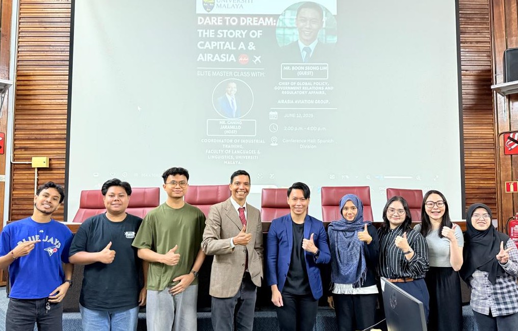 The Spanish Studies programme at the Faculty of Languages and Linguistics, Universiti Malaya, recently welcomed a distinguished guest as part of its Business and Administration module. This module featured Mr Boon Seong Lim, Chief of Global Policy, Government Relations and Regulatory Affairs at AirAsia Aviation Group, who joined the faculty to share his expertise with students and deliver an inspiring talk on “Dare to Dream: The Story of Capital A and AirAsia.”